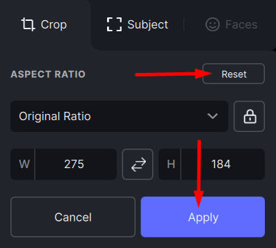 Click the Cancel button to return the original image size and cancel all changes for Crop or Rotation. Click the Apply button to save the selection.