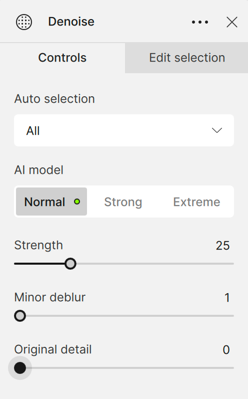 Use the Normal model to remove low-medium noise caused by low-light conditions or compression artifacts. It is ideal for images from smartphones and cameras with their own denoise models to avoid over-processing.
