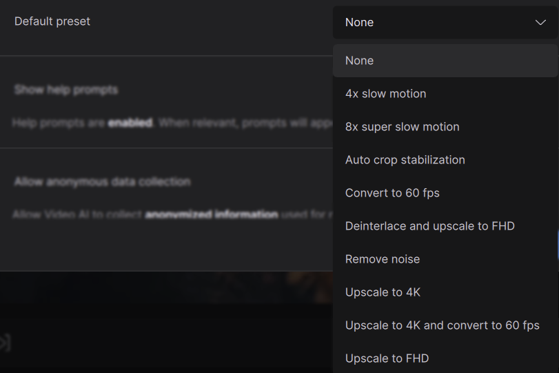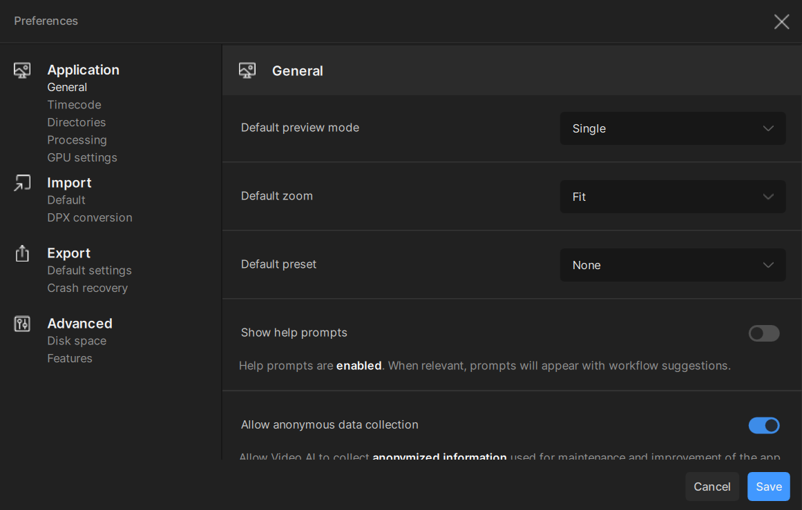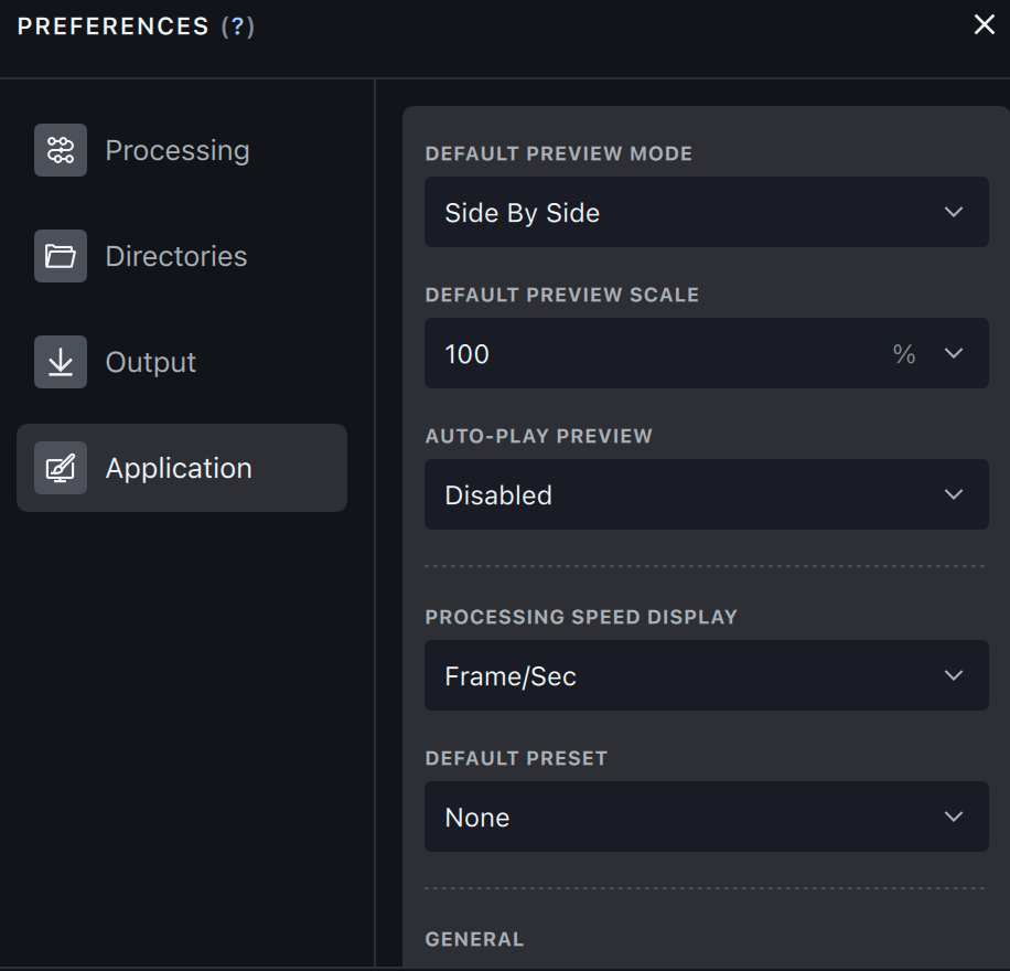 This category holds everything you need to adjust your preferences for the front end of the Topaz Video AI software. This section controls the preview experience, processing speed display, default preset, and the collection of anonymous data.