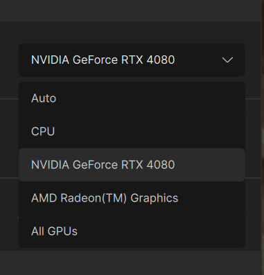The options displayed in the dropdown may differ based on your computer. Note: Apple Silicon processors will not have this option available, and will always use a combination of the device's CPU, GPU, and Neural Engine.