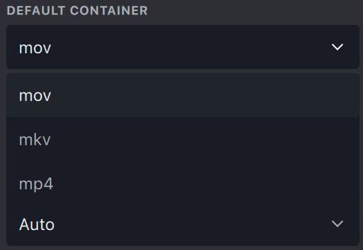 Choose the default file format for exported video files. Note, that this corresponds directly to the Default Video Codec.