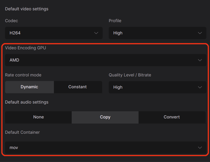 Please note, the following settings (within the red box) will change and adapt to the codec of your choosing.